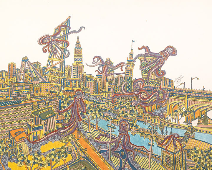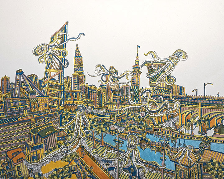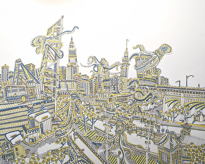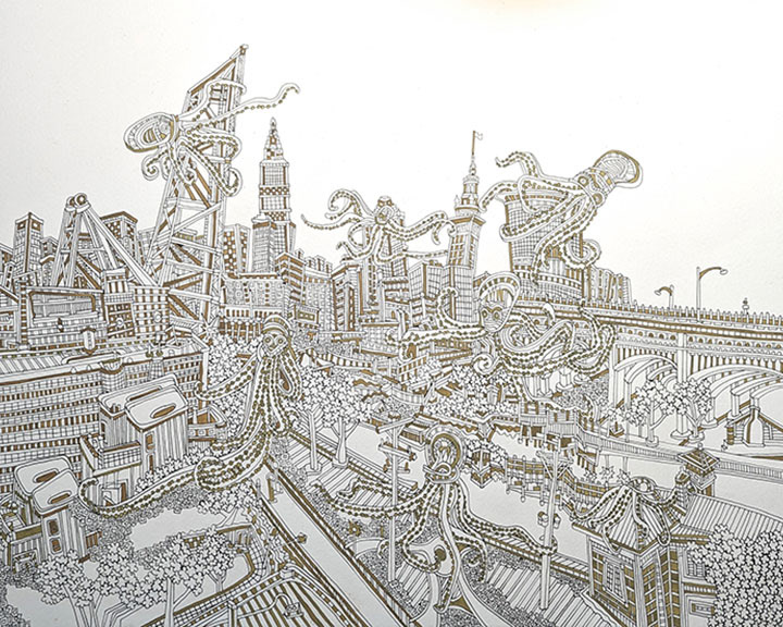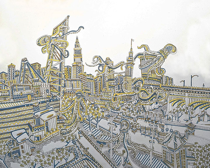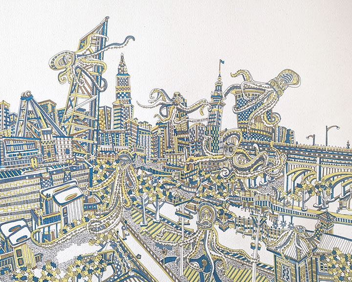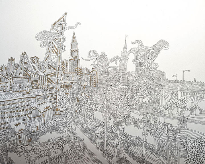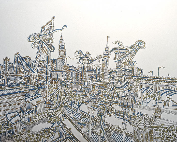Cityscapes are a perfect subject for my process. The angular properties of the buildings and various architectural elements allow me to draw out very tight, detailed compositions of patterns. The spacial relationships between buildings, as in overlapping and perspective, is what I convert from 3D to 2D in my head. I paint a lot of images of Cleveland as I’m proud of my hometown and feel like I’m exploring the city more with each piece. Any city has its proud residents and I paint others cities as well in hopes of connecting with those particular people.